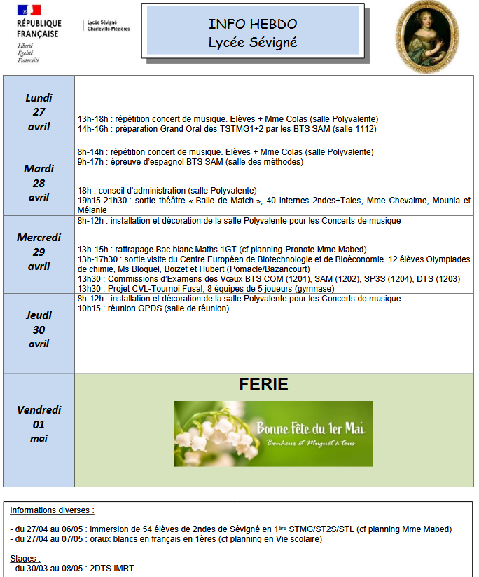 Lundi 26 et mardi 27 mai, les élèves de la section musique se produiront en concert dans la salle polyvalente du Lycée à 19h. Dans le cadre du partenariat entre la spécialité musique et Le Cabaret vert, le répertoire du concert portera notamment sur des artistes programmés lors de la prochaine édition du Cabaret vert. À l’issue du concert, seront proposés dans la cour du lycée une scène ouverte, des actions de prévention à la santé, un espace BD et une buvette.